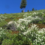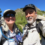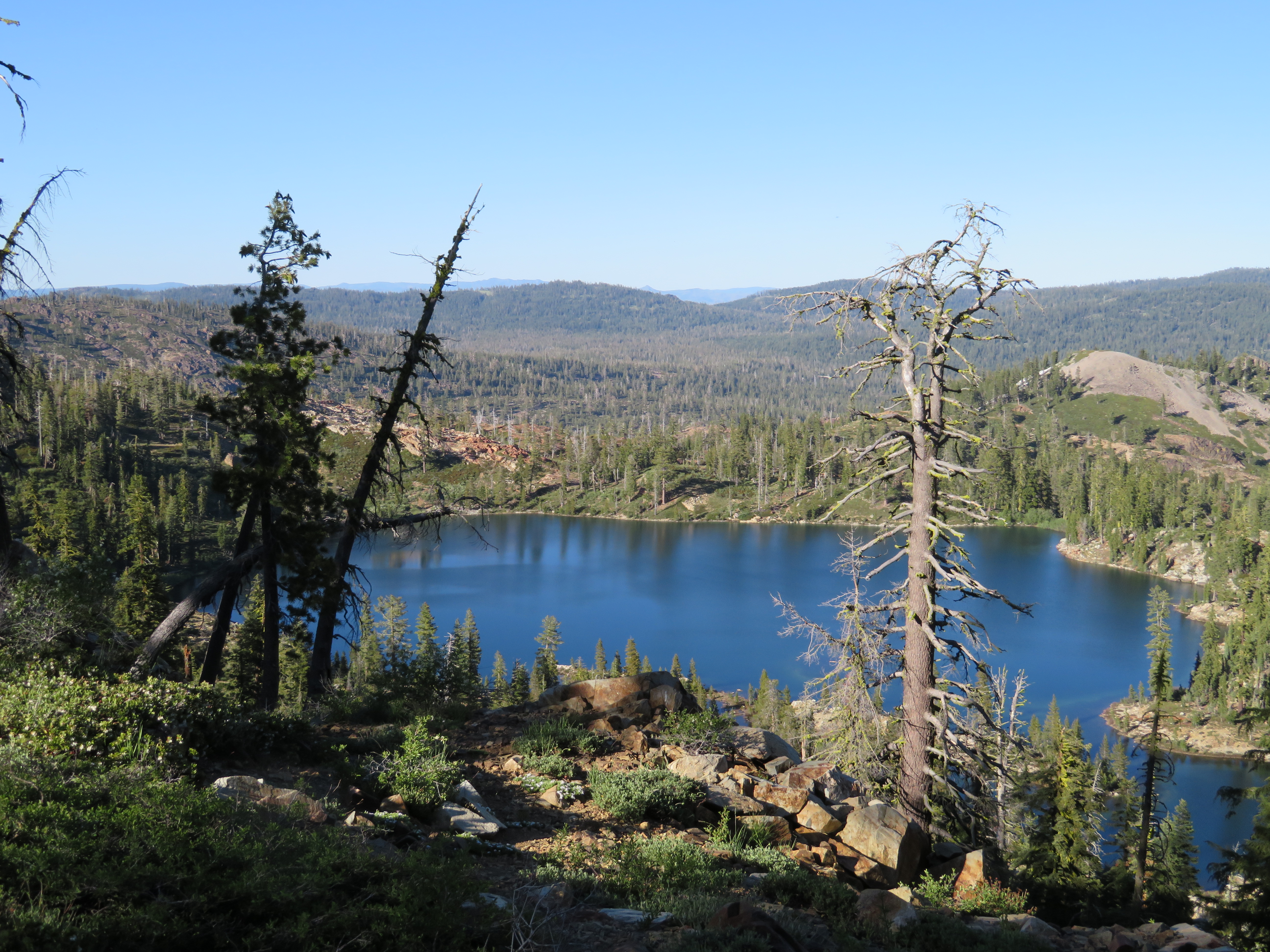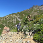 We are camped by the junction to Deer Lake Trail looking down on Deer Lake and Upper and Lower Salmon Lakes. It is a great spot to eat our peanut butter and nutella in a tortilla dinner. Here are the stats. 12.95 Miles at 2.3 MPH pace. Lots of elevation gain, around 3000 feet with our high point being 7479 feet. We are camped at 7330 feet. Onward tomorrow.