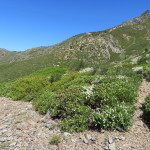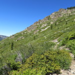 Shortly after our break, we come out of the forest and have great views of the Sierra Buttes. This is very beautiful country. We continue climbing, now in the sun, however there is a cool breeze which is making it quite pleasant. We can see Sierra City directly below us as we walk along a steep ridge. We make it to 7000 feet and are still climbing. The trail switchbacks around some steep slide areas and is more rock than dirt. We take a short break on the trail in one of the few flat spots we have seen. It is actually the trail that is flat here, 2 foot wide, with 70 percent grade above and below the trail width.