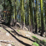 Very weird and something we have not seen before. We press on and start a descent off the hill top. We reach a trail junction that heads .3 miles to Whiskey Spring. Not needing water and after being disappointed by Jamieson Creek, we skip it and continue on. About 4 miles later we cross the paved Quincy LaPorte Road. There is a creek .3 miles down the road but we decide to press on to Alder Creek which is another two and a half miles but beyond our original planned camp.