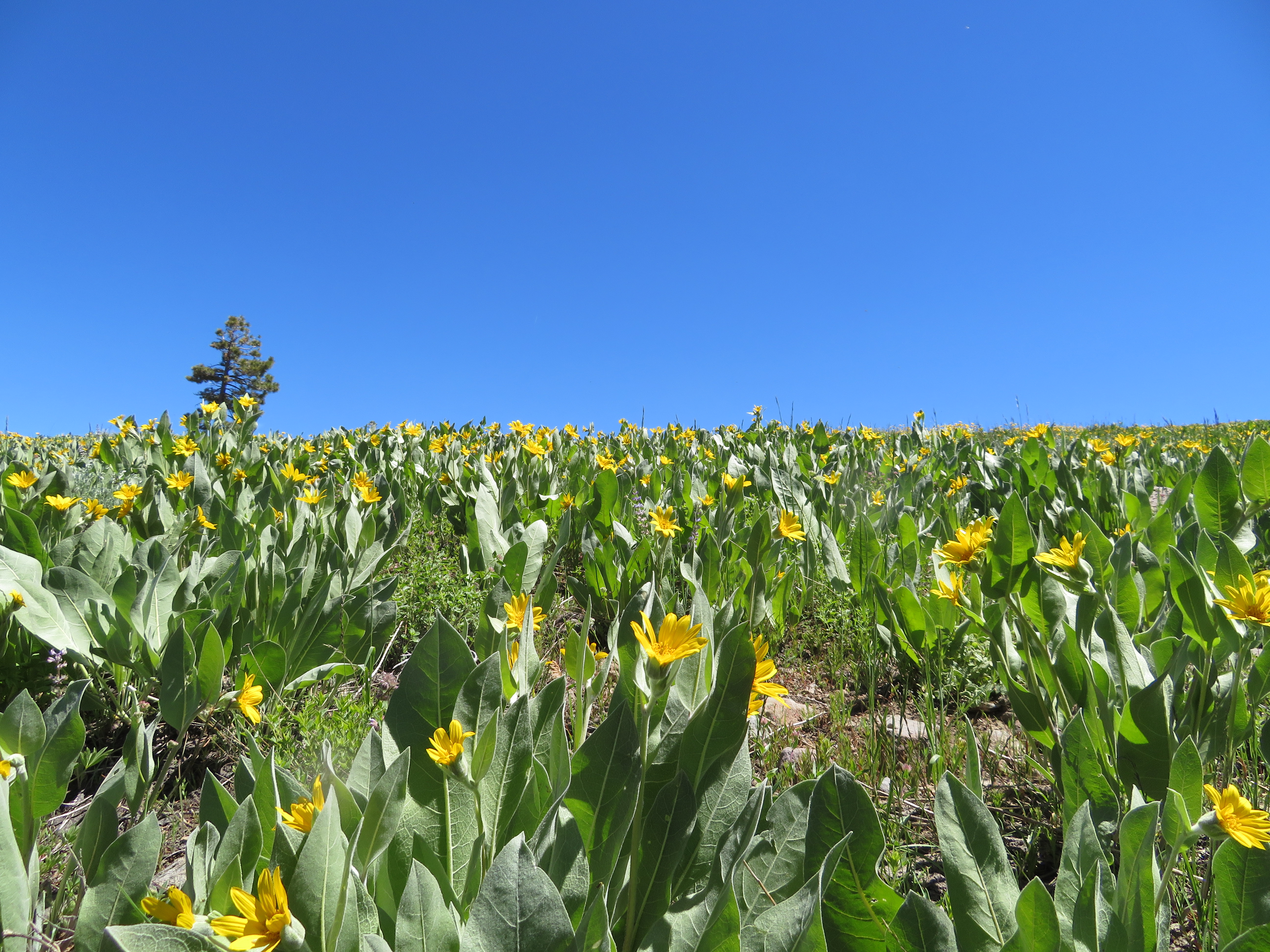 When we leave the creek, Carol takes the lead and seems to be constantly waiting for me. I just press on the best I can. There are large fields of yellow flowers that we hike through.