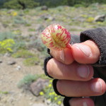 We climb and climb until we reach a beautiful hill top with 360 degree views and we both know that this is our lunch spot. There is a slight breeze and a gnarly tree to sit under. We lay out our pads and take a little lunch and siesta break. When I turn on my phone to take a panorama shot, I discover that we have a pretty good cell signal here. We did not have any in Sierra City, but two days away in the mountains, we are good. We take advantage of this to check in with some of our children and Carols mom. It is good to talk to them and to let them know we are safe. As we leave our lunch spot, we see some strange looking plants. They have a strawberry looking type of flower that is filled with air.