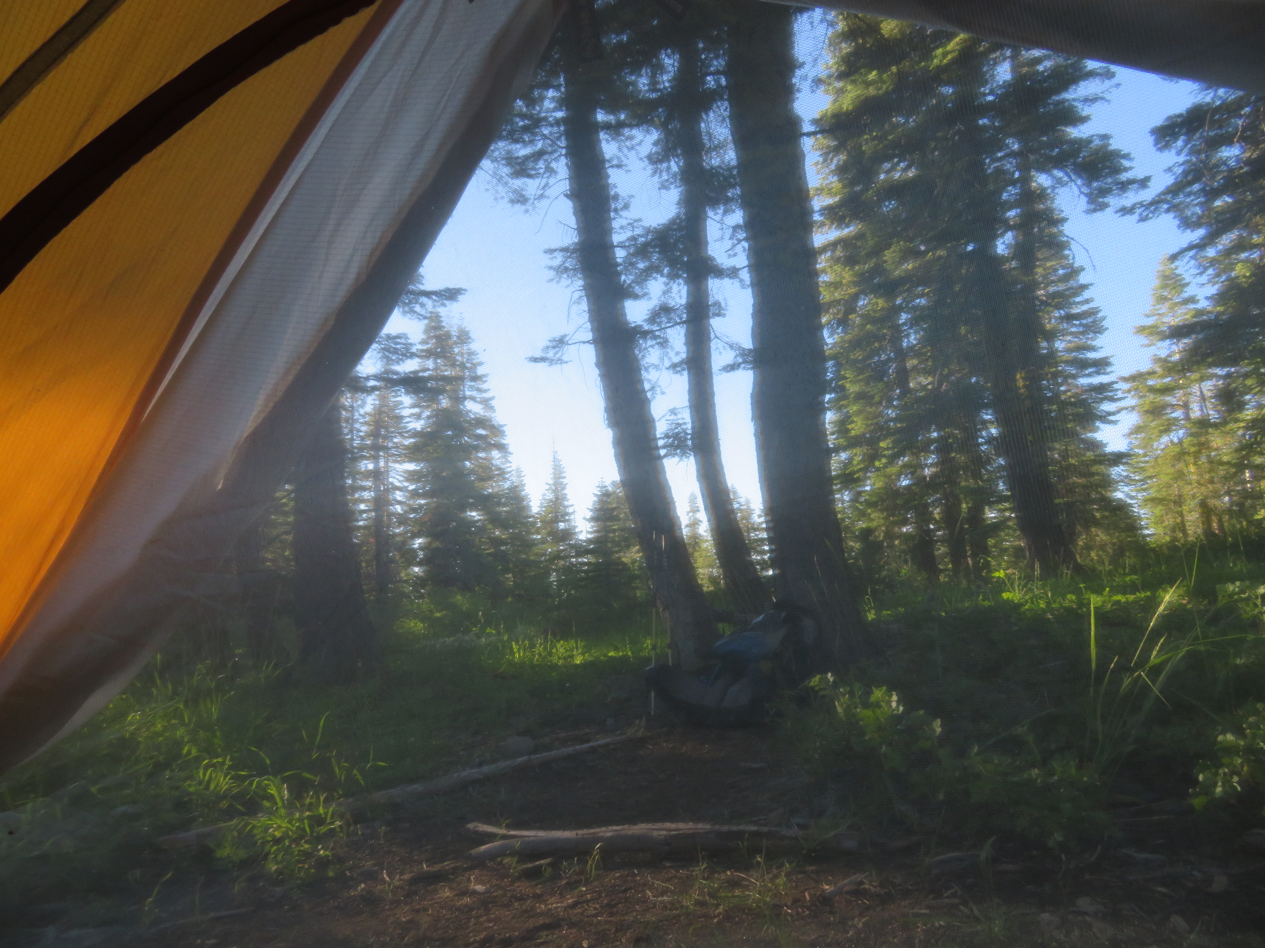 The walk from here is almost all wooded and I am hurting and tired but we make it to the junction of Alder Spring. We grab a camp site right off the trail and I head down the 800 foot long side trail to the spring. Of course it is down hill, and a little steep in spots. When I get there, Napoleon and Red Cross are nearby sitting with Sonia who we had met at the Clair Tappan Lodge and again in Sierra City. They are going on but Sonia is camping near the spring. She invites us to camp with her but I do not like the buggy feel of the place so politely decline. I fill up and filter quite a bit of water for both cooking and our hike tomorrow. As I sit there, the bees land on me and my water bottles. They have a perfectly good spring gushing all the water they could possibly want, yet they decide my bottles are where they want to be. Just don’t get it. Weighed down with water, I climb the trail back up to our site.