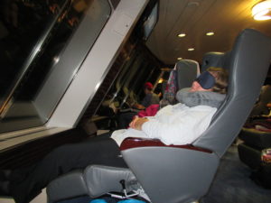 They tell us to try the purser’s desk after we set sail. The Ferry starts boarding at around 9:30 and we drive onto the boat just about 10 o’clock. We go up to level 8 and find Carol a seat. I then go to the pursers desk and lucky us, some reserved seats have opened up. They have two that are next to each other but separated by an aisle. I take them and go back to give Carol the good news. These work out great as they are in the back of the room in front of the outside window with a ledge we can put our feet on and stretch fully out. We do not even wait for the ship to set sail before we put in our ear plugs, eye masks on, pillows tucked behind our heads, and sleeping pills taken. Hopefully it will be a good night’s sleep.